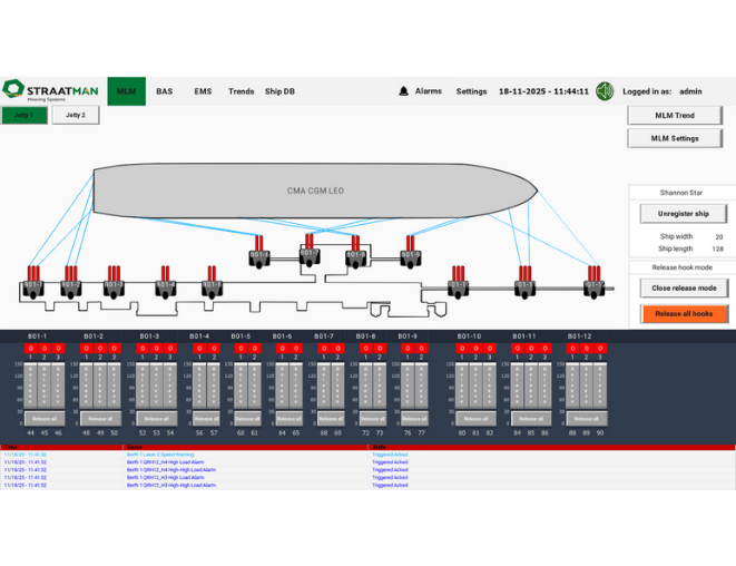 La visualización, historial de las cargas de amarre y las alarmas configuradas por el cliente, están integradas en nuestra plataforma de software. Una vez que un barco está amarrado al delfín, el valor de carga real de cada celda de carga se enviará al software de monitoreo. El tablero en línea muestra los datos de la carga en cada línea y cuando se exceden los límites de carga máxima, los operadores serán advertidos de inmediato.