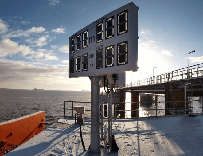 Um sistema laser mede a distância desde o molhe até ao lado do navio que se aproxima. Os valores medidos são mostrados num grande visor no molhe e na sala de controlo. A tecnologia Led no ecrã é desenvolvida pela nossa empresa irmã interna FactoryLab.