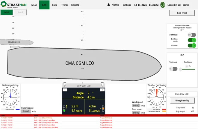 O sistema Straatman Berthing Aid System ou o chamado Sistema de Auxílio à Atracação é baseado na mais recente tecnologia laser e LED. O sistema laser medirá a distância desde o molhe até ao lado do navio que se aproxima. Além disso, num PC padrão, todos os valores podem ser exibidos num grande visor como a distância (proa e popa), a velocidade de aproximação e o ângulo. Uma vez que o visor se baseia na tecnologia LED, somos capazes de mostrar também outros parâmetros como velocidade do vento, corrente, ondas ou outra informação crucial, a fim de garantir uma amarração segura.